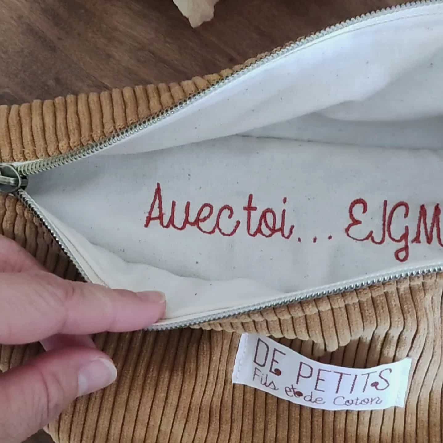 Tu vas pouvoir broder un surnom, de jolis mots sur le tissu extérieur ou sur la doublure, en choisissant la couleur du fil et sa police d’écriture.